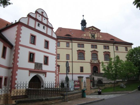 Krásně opravené objekty ve Lnářích, vlevo tvrz a vpravo bývalý vládní zámek