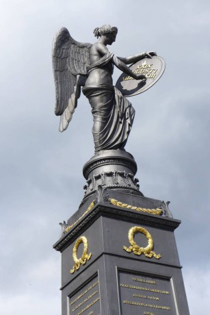 ...architektonickou část navrhl architekt Nobile, reliéfní plastiky vytvořil sochař Josef Max, který také zvolil jako předlohu pro sochu na vrcholu kopii helénské bohyně vítězství Niké, krátce předtím nalezené v italské Brescii...