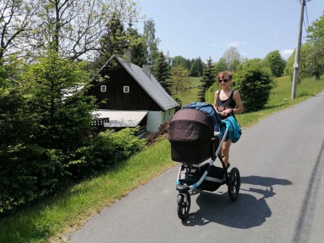 ...terén je tu náročný, buď tlačíte do prudkého kopce nebo brzdíte co to jde, aby vám kočárek neujel dolů do Jizery...