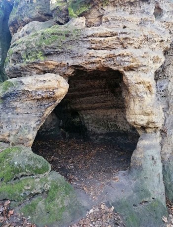 ...zajímavé je předhradí se skalními byty s velkým 9,5 metru hlubokým tesaným prostorem využívaným původně jako zásobnice...