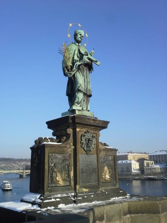 První a jediná bronzová socha svatého na mostě, která představuje domnělého mučedníka zpovědního tajemství, Jana Nepomuckého, byla vztyčena k předpokládanému 300. výročí jeho shození z mostu.