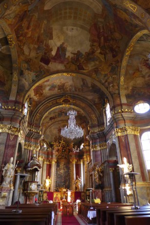 ...a spatřil vnitřní sálový prostor, jehož klenba je zdobená freskovou malbou od Václava Vavřince Reinera z roku 1741. Na oltářích i v chrámovém prostoru jsou umístěny plastiky Františka Weisse z let 1741 až 1743.